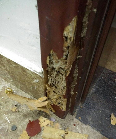 當(dāng)日,李師傅在張女士家中發(fā)現(xiàn),她家里的木質(zhì)家具較多。據(jù)介紹,她入住該房屋才兩年時間,前幾日中午回到家時,不經(jīng)意間用手觸摸到自家房門套表皮,感覺有點異樣,用手指使勁一摁,居然癟了下去。接著撕開門套表皮發(fā)現(xiàn),一大堆白蟻正在啃噬著門框,嚇了張女士一大跳。